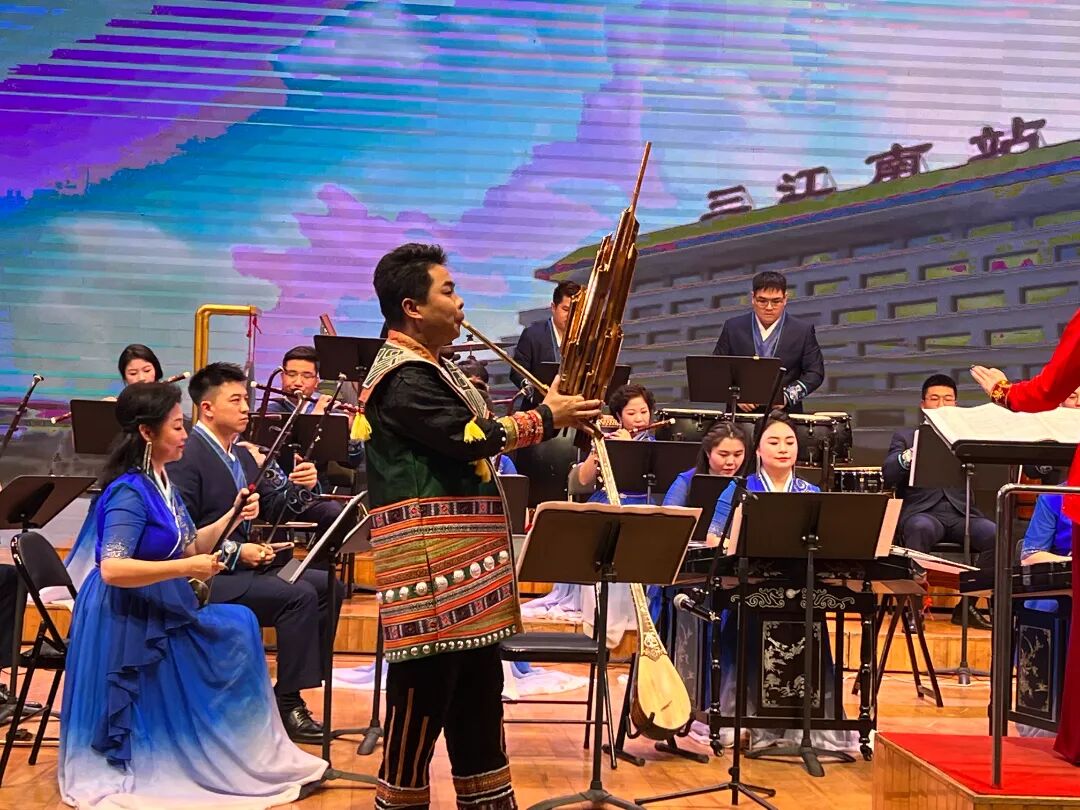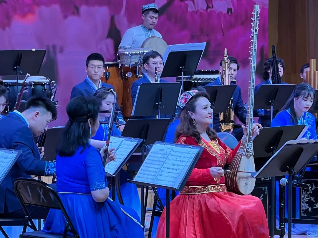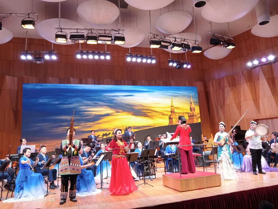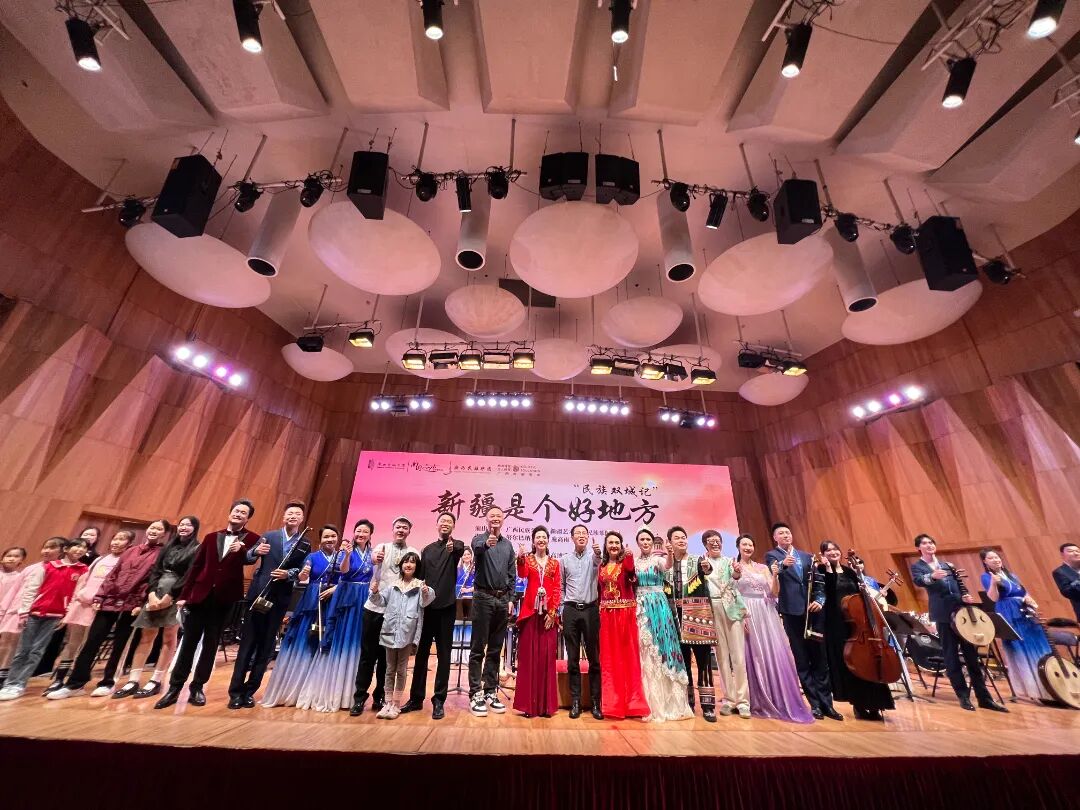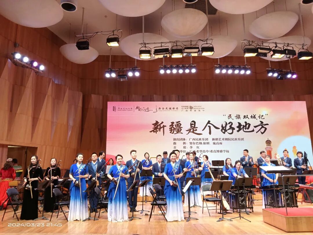 接下来是两座民族风情各异的城市的音乐交相斗艳。《三姐的歌谣》、《可爱的一朵玫瑰花》、《花儿为什么这样红》……音乐家们身着民族服装,熟练而充满深情地演奏着各式乐器——新疆的萨塔尔、弹布儿、手鼓,广西民族乐团的二胡、琵琶、长笛、洋琴、琐呐、芦笙,以及大提琴、小号、键盘乐等西洋乐器,交织成壮丽的乐章,组成视觉和听觉的盛宴,令人陶醉。