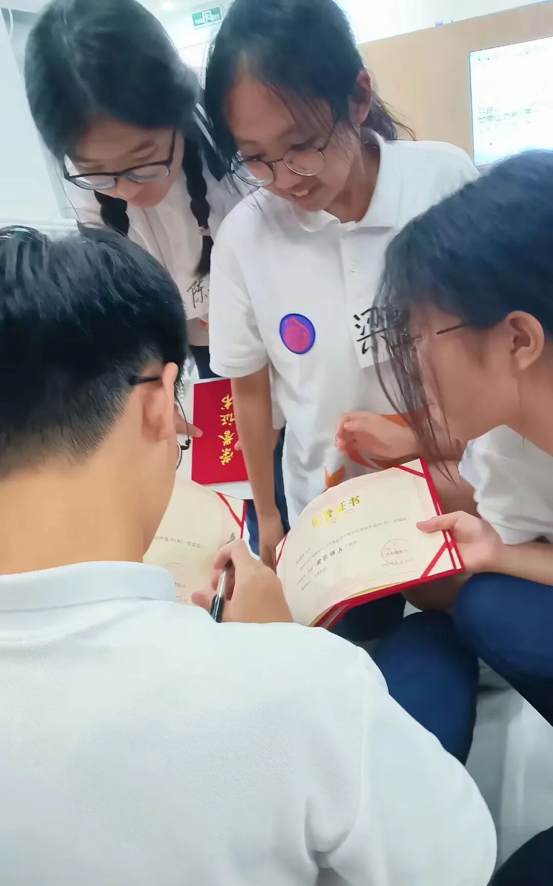 ![]() 诗词雅集的落幕并没有减少同学们的热情。散会后,初一同学兴奋地围着自己欣赏的“校园诗人”,请求他们在荣誉证书上签名。这一场面充满了青春的气息,展现了同学们对他人才华的认可和钦佩。